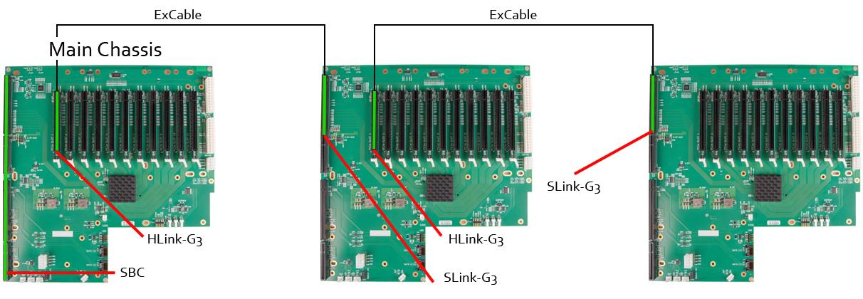 All x8 PCI Express slots in the master chassis (containing the SBC) are populated with a HLink-G3 card. Each HLink-G3 is then connected to an expansion chassis using an ExCable-G3 and SLink-G3 card. This configuration provides a high number of available PCI Express slots supporting low latency.