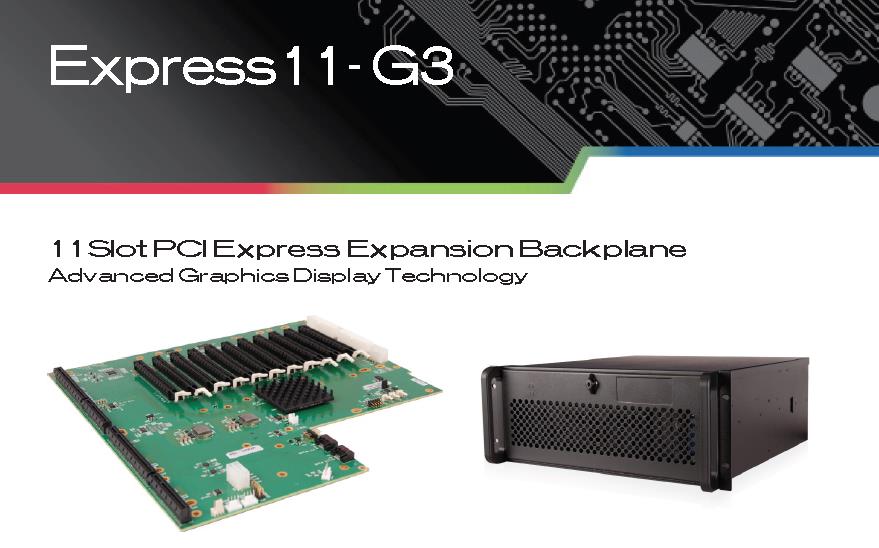 The Datapath Express11-G3 backplane provides 11 x8 lane PCI Express slots, all implemented as x16 physical connectors. They can be used with a standard PICMG 1.3 SBC as a stand alone system or in combination with multiple backplanes to provide a PCI Express expansion system for a standard PC.